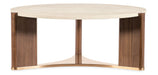 The Eleana Round Table is a refined centerpiece featuring a honed marble top with white and beige tones, perfectly complemented by a Light Caramel walnut veneer base and plated Sunlit Bronze metal accents. Its round shape and triangular pedestal design bring a sense of sculptural balance and sophistication, ideal for transitional living rooms that value both beauty and functionality.