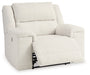 This oversized power recliner seamlessly complements your contemporary cozy space. Bold block arms accentuated with form-fitting padding lend a high-style silhouette. An ample seating area invites you to sprawl during binge watches and relaxed reading hours alike. And with reclining at the press of a button, this piece proves chic design and superb comfort go hand in hand.