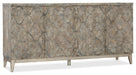 With a delicate and delightful grooved quatrefoil pattern on its doors, the Fairfax Credenza is crafted of Oak Veneers and Aluminum Sheet, accented with silver-colored zinc alloy tab pulls. The wood is in a distressed medium finish with hand planking. Four doors with one adjustable wood shelf behind each set of doors. Ventilated back panel.