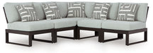 Sleek, contemporary style meets outdoor living in this sectional. Its clean-lined black aluminum frame and resin wicker back expertly balance good looks and longevity. The enhanced UV resistance of Nuvella+™ fabric keeps the cushions light and bright, weathering the seasons beautifully. And the modular design allows you to switch up the layout when it’s time for a refresh. With this sectional on the back porch or poolside, you can confidently curate a luxe vibe.