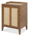 The Archives Two-Door Nightstand is a unique addition to any bedroom. Featuring a Mottled Amber faux-tortoise shell finish and woven cane door fronts, this nightstand combines texture and style. Inside, an adjustable shelf provides versatile storage, while a pull-out tray and gallery rail on top add functionality to this chic, medium wood piece.