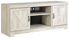 Express your farmhouse style with this entertainment center. Its wispy white finish over replicated oak wood grain is a delightful change from the ordinary. Clean-lined, classic styling with barn door inspiration provides a country chic aesthetic that’s a breath of fresh air. Combination of cabinet storage and open display space with LED lighting makes for just the right mix.
