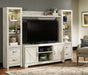 | Details | Includes TV stand, 2 piers and bridge, Made with engineered wood (MDF/particleboard), Antiqued white finish over replicated oak grain, TV stand with 2 storage cabinets (each with an adjustable shelf) and removable/adjustable center shelf, Cutouts for wire management and ventilation, Each pier with 2 glass shelves and cabinet door revealing single-shelf storage; overhead LED lighting; reversible cabinet doors can open left or right with consumer assembly modification , Assembly required | |
