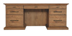 Celebrate the dramatic vistas and natural beauty of the American wilderness with the grand Big Sky Executive Desk. Crafted of rustic Pecky Hickory Veneers in a Vintage Natural finish with a solid wood edged top and a top-grain-leather writing surface, the desk has 7 drawers including a center drawer with drop-front for use with the keyboard. The left and right top drawers each have two removable dividers, one removable pencil tray and writing insert that can be used on either side. The left and right second drawer locks and has two removable dividers. The left and right bottom drawers are locking file drawers with Pendaflex letter/legal system. On the visitor’s side of the desk is an arch design.