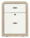 - Two-tone finish features elm veneers in a pebble hue with drawer fronts in a contrasting ivory with leathered texture