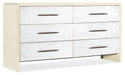 Svelte and sophisticated in a serene two-tone finish combining a palette of white, cream and taupe, the Cascade Dresser with six self-closing drawers is a stylish statement piece brimming with storage. The top drawers have a removable gray felt liner, the right top drawer has a removable gray felt jewelry tray and the bottom drawers are cedar-lined. The outside of the case is in Pebble Beach, a lacquered burlap finish, and the drawer fronts are in a soft white finish in cast resin accented by champagne-colored bar pull hardware.