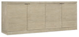 Serene and simple with a soothing neutral color palette, the TV-ready Cascade Credenza helps you create a place of retreat in your home where you can slow down and relax. The credenza is finished in Terrain, a soft taupe finish on Oak veneers with dry brushing and accented by champagne-colored tab pull hardware. Four doors with soft-close hinges and one adjustable shelf behind each pair of doors. There’s a ventilated back panel with one power supply and levelers. Accommodates up to a 75-inch TV.