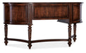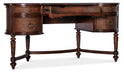 Inspired by the tropical craftsmanship of the West Indies and classic British and Dutch Colonial design periods, the Charleston Writing Desk has a timeless kidney shape, stretchers, rattan drawer fronts, intricately-carved leaf motifs on the legs and a robus leather writing surface top. Crafted of Cherry Veneers, Rattan and Resin, it is finished in the deep, rich Maraschino Cherry. There are five drawers. The left and right top drawers have one removable partition, one writing slide and pencil tray for use in either drawer. The center drawer has a drop-front for keyboard use. Antique bronze round knobs and ring-pull hardware add the finishing touch.