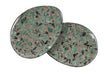 In a dynamic blend of shapes, materials and color, the Antares End Table is a stone-topped, two-tiered design. The textured metal base is complemented by soap stone tops with flecks of green, black and charcoal. 24-inches round.