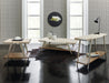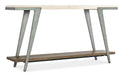 Modern materials meet timeless surfaces in the mixed-media Boomerang Console Table. With an eclectic elegance, the 61-inch-wide table combines a Travertine marble top with a metal frame and legs and one wood fixed shelf. Crafted of Oak Veneers, the marble top is cream colored with a natural medium wood finish and gray metal frame and splay legs.