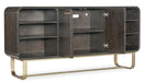 A sleek gold metal base and accents combine with a dark finish over Oak Veneers to create the chic and multi-functional Metropolitan Credenza. Use it as a bookcase, entertainment center, storage piece, entry piece or serving piece. There’s one adjustable shelf behind the pair of center doors, two adjustable shelves on the left and right sides, and the back panel behind the doors has ventilation and wire management. Measures 74 W x 19 D.