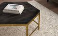 A tactile, earthy Mango Wood top combines with an elegant gold metal base in the Octavius hexagonal-shaped cocktail table, creating a youthful yet timeless style.