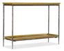 Warm and cool metals merge in the alluring and retro Commerce & Market Tray Top Metal Console. The tray top and tray shelf have a gold finish, and the slender metal base is in a gray finish.