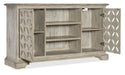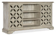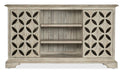 A whimsical floral cutout motif on each of the doors gives a charming cottage farmhouse appeal to the Underhill Entertainment Center. The Oak Veneers are finished in a light gray color with distressing and a planked design on the back panel. The two doors have soft-close hinges and magnetic catches, and there’s one adjustable shelf behind each door. The open middle section has two adjustable shelves. The interior finish matches the exterior finish.