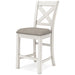 | Details | D642D7: Includes dining table top and base, Made with rubberwood solids, ash veneer and MDF substrates, Antiqued white finish with wood grain texture, Two 10-bottle wine storage shelves (1 reversible), Lower door cabinet accessible from both sides, 2 pass-through drawer bins, Assembly required, D642-124: Made with wood, Antiqued white finish with wood grain texture, Foam cushion with polyester upholstery, Nailhead trim, X-back, Assembly required, | |