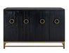 4 Door, Console. The Ebano Console, features a breathtaking top made from natural stone, ethically sourced from a quarry. This stunning piece brings an air of elegant sophistication to any room. Its metal base provides reliable support and creates a striking contrast with the stone's organic texture. The custom metal pulls adorn the doors in a luxurious golden finish, enhancing the captivating black-and-gold contrast. The sleek black finish of the Ebano Console reflects a modern deco design and makes it a truly eye-catching addition to your decor. Using multiple species of wood in its construction showcases different grains, adding uniqueness. Transform your living area with this inspiring black furniture console that seamlessly combines functionality with aesthetic appeal.