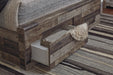 Modern yet hefty. This queen panel bed with storage makes an urban eclectic statement. Seasoned raw wood look merges with the clean lined design we love today. Muted rustic finish over replicated pine grain maintains its authenticity for a beauteous look. Storage in the footboard and underneath the bed provides ample space for placing belongings out of sight. Mattress available, sold separately.