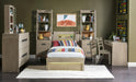 Clean contemporary forms and multi-functional pieces create the energetic District collection by Legacy Kids - Teens. The collection is crafted of Straight Oak with a Oak finish and accented by rustic pewter hardware. All sizes of the panel beds have inset headboards and footboards with lighting operated by remote control or an app that can be downloaded allowing children and teens to control lighting colors patterns and intensity and even to program lighting to correspond to the rhythms of the music.