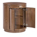 The Eleana Round Nightstand features a beautiful starburst veneer top, touch-latch wood doors, and a pull-out tray for added versatility. Finished in Light Caramel walnut veneers with Sunlit Bronze hardware, this piece is perfect for adding warmth and luxury to any bedroom.