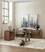 With a craftsman flair, this three-drawer Elon Desk Pedestal is crafted of Flat Cut Walnut Veneers in a Medium Wood finish with dark bronze metal bar pulls. The top drawer has two removable dividers, one writing insert and one removable pencil tray. The second drawer has two removable dividers and the third drawer is a locking file drawer with pendaflex letter/legal filing system. Finished back.