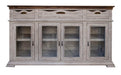 3 Drawer 4 Glass Door Console. Presenting the stunning Gray console, meticulously crafted from solid pine wood and featuring exquisite hand-carved drawers, elevating the ambiance of any room. Skillfully finished by our artisans, it boasts a sophisticated gray tone with deep brown accents on the tops, adding a touch of elegance to your space.