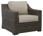 A great chair for lounging on the back patio, Jones features extra thick cushioning with an ultra-plush seat for relaxing and enjoying the view in luxurious comfort. Gently sloped arms and a combination of beige seating and brown wicker give this set a transitional look perfect for the great outdoors. Crafted with full-round resin wicker that surrounds a solution-dyed acrylic cover and open cell cushions, this lounge chair is stain, sun, and weather-resistant, making it ideal for outdoor use. The aluminum frame offers the look of wood but in a rust-resistant package, ensuring your chair stays looking like new for years to come. With its comfortable cushioning, durable materials, and stylish design, the Jones Outdoor Lounge Chair is the perfect addition to any outdoor space. Whether you're enjoying a book in the sun or entertaining guests, this chair will provide the perfect spot to sit back, relax, and enjoy the outdoors in style.