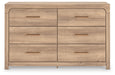 The natural wood tones and clean lines of this dresser echo your easygoing style sensibilities. With a warm finish and replicated oak grain, its carefree character lightens up your bedroom. Curved inner corner details soften the look, while sleek bronze-tone hardware modernizes the feel.