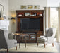 This gracious silhouette with classic column motifs and a rich, traditional finish with elegant cathedral and swirl mahogany veneers creates a grand setting for entertainment with family and friends. This functional piece accommodates up to an 80-inch TV with one center channel speaker area, 2 adjustable shelves behind each door and one 3-plug electrical outlet. The channel speaker area measures 39W x 18 ¾ D X 6H.