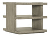 Organic and rustic with a modern silhouette, the Overlook Trails End Table has two open spaces, one fixed shelf and a plinth base. Crafted of Oak Veneers, the table is finish in Mink, a soft smoked gray.