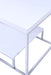 A contemporary collection of tables featuring chrome bases and white tops. An asymmetrical bottom shelf adds function as well as style to the collection and the Silvershield® top adds beauty and texture to the cocktail and end table.