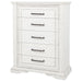 Timeless in spirit and refined in detail, this five-drawer chest evokes quiet charm and lasting beauty. A vintage white finish softens its stately frame, while molded edges and antique bronze ring pulls add character and depth. Designed with thoughtful craftsmanship, it offers spacious storage and smooth functionality. Built from poplar, engineered wood, and veneer, it brings elegance and purpose to the bedroom.
