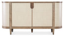 Crisp and current like fashion apparel, the Mélange Arbor Credenza has a two-tone neutral color palette combining Oak Veneers in a medium wood finish on the frame, top and legs with a contrasting canvas crackle in a parchment color on the doors and sides. The two doors have soft-close hinges and magnetic door catches. One adjustable shelf behind the doors.