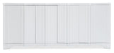 A soft modern silhouette with classical inspiration, the Corinth Entertainment Console has a white plaster finish with light blue interior, bracket feet and a dimensional front with columns used to open the doors. Behind the left and right doors are two adjustable shelves, and one drawer behind the pair of center doors. The top of the drawer creates a fixed shelf. Accommodating up to a 75-inch TV, the console has a ventilated back panel and a power supply.
