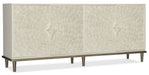 A creamy white finish with a subtle shimmer combines with capiz shell inlay and a silver-colored metal base and feet for a stylish focal point designer piece that also accommodates up to a 75-inch TV. The four wood-framed doors with capiz shell inlay have soft-close hinges and one drawer behind each door. Ventilated back panel and power supply. Crafted of Hardwoods, shell and metal.