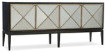 The essence of refined glamour, the Melange Jova Credenza is crafted of Birch Veneers and antique mirror with gold and silver fretwork on the four glass doors. There’s one adjustable shelf behind each set of doors, and the doors have soft closing hinges. The finished on the outside of the case is a distressed black. Ventilated back panel.