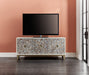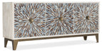 Create an atmosphere of celebration every day with the uplifting Liberty Entertainment Console, featuring a festive starburst bone inlay pattern in colors of white and blue and brown. Gold provides a sparkling accent color on the metal base and hardware. This functional piece, crafted of Mango Wood with bone inlay and iron has one removable shelf behind each door and a ventilated back panel. Accommodates up to a 70-inch flat screen TV.