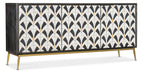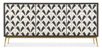 The striking staccato style of the Renee Credenza is expressed with a black wood finish accented by beige, brown and bone inlay on the door fronts. Crafted of Mango Wood, the credenza has 3 doors with touch latches, one fixed shelf behind each door and wire management holes in the back. A gold metal base and legs complete the eclectic design.