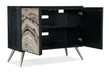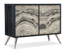 With stunning geode-patterned reverse painted glass doors in a black and ivory pattern, accented by silver metal legs, the Rockee Two-Door Chest takes organic style to the next level. Behind each of the two doors is an adjustable shelf. Crafted of Oak Veneers with Glass and Stainless Steel, the chest has a ventilated back panel.