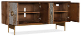 In a study of juxtapositions, the media-ready Russell Credenza combines linear and circular forms and a mix of materials including mango wood, bone inlay and brushed gold metal ring pulls and a gold metal base to create a striking contrast that is sure to take center stage in any space. Offering a ventilated back panel, the credenza accommodates up to a 65-inch TV. Four doors with bone inlay and soft-close hinges with one adjustable/removable shelf behind each pair of doors.