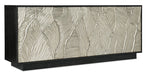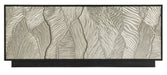 Bring the glamour of the Big Screen to your home entertainment with the Summit Gorge console, featuring a black wood finish and dimensional door fronts in a silver tone. Crafted of Oak Veneers and Resin, the console has four shaped touch-latch doors, with one adjustable shelf behind each pair of doors. Accommodating up to an 80-inch TV, the console has one adjustable shelf behind each pair of doors, a ventilated back panel with wire management and hand holes and a power supply.