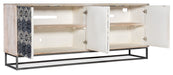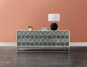 An abstract art pattern created with bone inlay in a black, white and gray color scheme makes the Whitmore Credenza a one-of-a-kind artistic accent. Crafted in Mango Wood, the four-door credenza has a removable shelf behind each pair of doors, a ventilated back panel and wire management.
