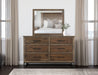 6 Drawer, Dresser. The Teca collection captures the essence of transitional design by seamlessly blending metal and wood elements. It is meticulously crafted from sustainable mango wood and teak veneer with a translucent multi-step brown finish.