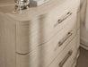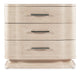 With a curved breakfront design and soft, flowing edges, the Nouveau Chic Three-Drawer Nightstand brings a clean neutral palette and casual modern style to your space. Crafted of Cathedral and Quartered Oak Veneers, it is finished in the serene Sandstone with light wire brushing. The stepped bracketed bar pulls in a nickel finish emulate the stepped-top of the case and plinth base. The drawers have cream-colored painted interiors and there are two USB charging ports and a cord clip on the back.