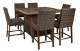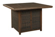 | Details | Accommodates up to 8; bar stools sold separately, Door conceals gas propane tank (not included), Rust-proof aluminum frame with wood-look tabletop, Side panels accented with all-weather, handwoven resin wicker, 56" square fire pit table with CSA-approved 55,000 BTU stainless steel burner, glass beads, burner cover and enclosed storage area with shelves, Battery-operated ignition system with adjustable flame control; battery included, Convertible to natural gas, Gas line or propane tank connector hose not provided, Assembly required, Comes with protective weather cover | |