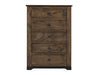 5 Drawer, Chest. The exceptional Parota III Bedroom Collection showcases the beauty of Parota wood, native to Mexico and South America, It features panels and tops crafted from this stunning wood, incorporating butterfly joints between slabs combined with sustainable mango wood for the rest of the case piece. The translucent multi-step lacquer in brown allows the natural grain of the Parota wood to shine through beautifully. The collection also includes hand-forged iron details on the headboard and mirror, giving each piece a distinctive look. Additionally, the drawer fronts are adorned with decorative nails arranged in two vertical lines on either side of the knob handles. Elevate your bedroom with the unique charm and sustainable craftsmanship of the Parota III Bedroom Collection, where exquisite design meets eco-friendly elegance.