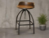 Wooden Seat Adjustable 24-30" Swivel Iron Base Barstool. Introducing our adjustable swivel Pueblo barstool. You'll love the industrial feel of its matte black iron base and the way it's complemented by its wooden curved low back seat. Its iron base can be adjusted from 24 inches to 30 inches, making it perfect for your counter-height or bar-height table.