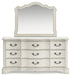 | Details | B980B2: Includes headboard, footboard and rails, Made with hardwood solids, spruce veneer, MDF substrates and cast resin components , Antiqued white painted finish, Polyester upholstery, Button tufting, Foundation/box spring required, sold separately, Mattress available, sold separately, Assembly required, B980B1: Includes dresser and mirror, Made with hardwood solids, spruce veneer, MDF substrates and cast resin components, Antiqued white painted finish, 9 drawers with fully finished interiors, French and English dovetail construction and ball-bearing side glides, Metal bar pulls with aged pewter-tone finish, Mirror attaches to back of dresser, B980-93: Made with hardwood solids, spruce veneer, MDF substrates and cast resin components, Antiqued white painted finish, 3 drawers with fully finished interiors, French and English dovetail construction and ball-bearing side glides, Metal bar pulls with aged pewter-tone finish, 110V power supply with dual USB charging ports, Power cord included; UL Listed, | |