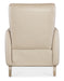 A harmonious blend of curvaceous lines, the Rumero press-back upholstered leather recliner has shaped arms and a modern bustle-style back. Curved wood legs in a light finish add to the sense of energy in the silhouette. The semi-aniline top-grain leather cover is called Apollo Mineral.