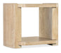 The Retreat End Table has a tranquil personality with a modern twist. Simple, clean lines are in a chunky square shape with rounded corners and interlocking block-style legs. Crafted of Oak Veneers, it is finished in the sand-colored Dune, transparent by design to reveal the unique grain patterns of the wood veneer. One lower fixed shelf.