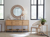 Inspired by tropical getaways, the Retreat Raffia End Table is a mixture of organic materials in a laid-back and versatile design. The table combines Maple Veneers, Raffia, Rope and Tempered Glass, with a Painted Raffia top and bottom shelf in a Seagrass Green finish, a glass-top insert and Rope accents. The frame and legs of the table are finished in the sand-colored Dune, transparent by design to reveal the unique grain patterns of the wood veneer.